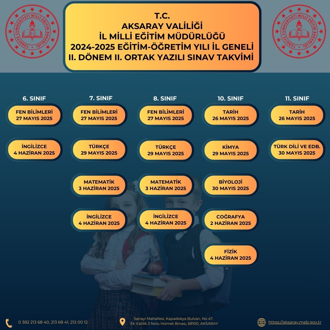 2024-2025 Eğitim öğretim yılında 2.Dönem 2.Yazılı sınav olarak İL genelinde yapılacak ortak yazılı sınavlar ve tarihleri belirlenmiştir.